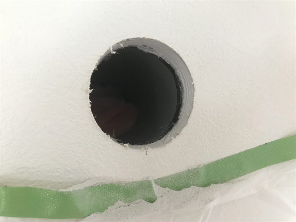ということで岩村建匠では、ある程度の予想の範疇で、そういった事態に備えるための「ここ、穴空いても大丈夫だよ〜」というスリーブを設置しております。その穴はちゃんと室内側の防湿シートとも、外部の防水シートとも連結されていて、穴が空いたとしてもしっかり対処できるようになっているのです。
